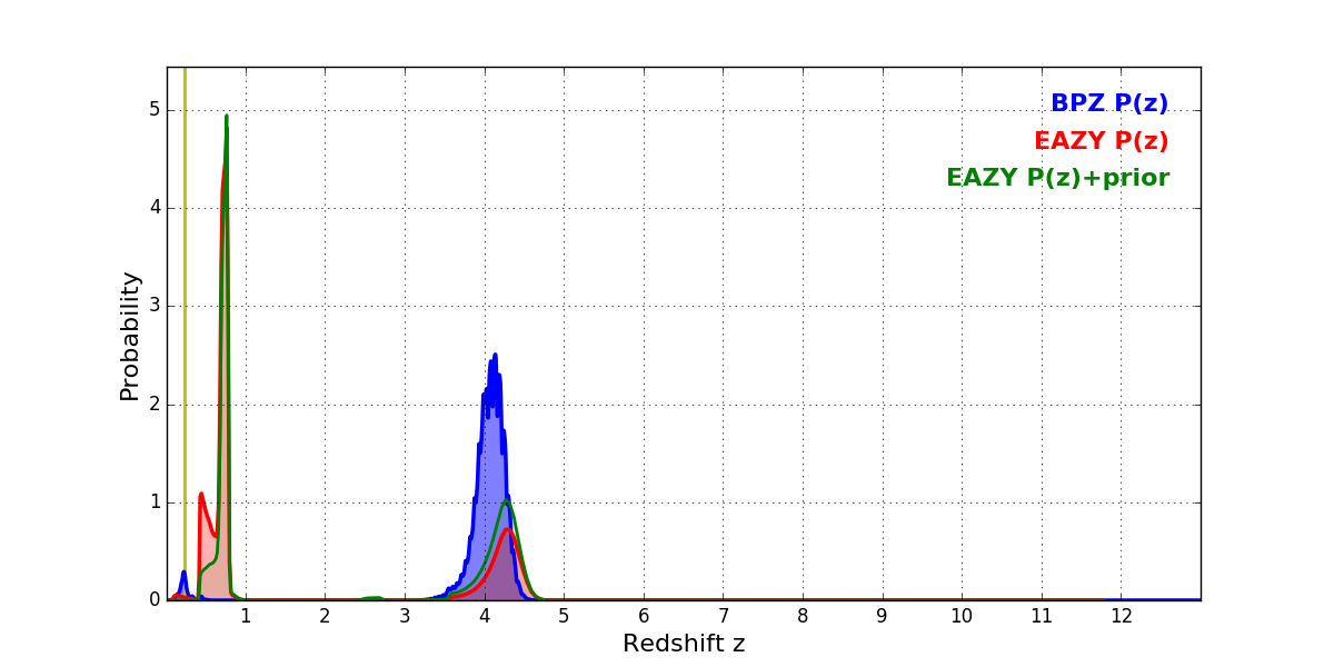 In P(z) plots: Yellow lines mark the cluster redshift z = 0.228,