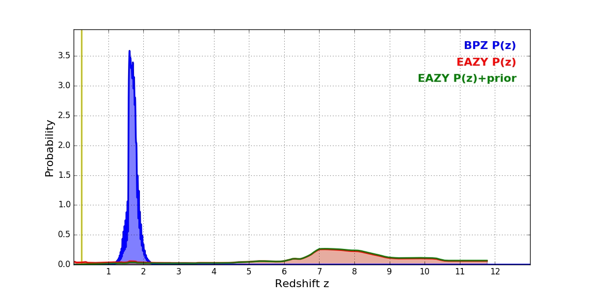 In P(z) plots: Yellow lines mark the cluster redshift z = 0.228,