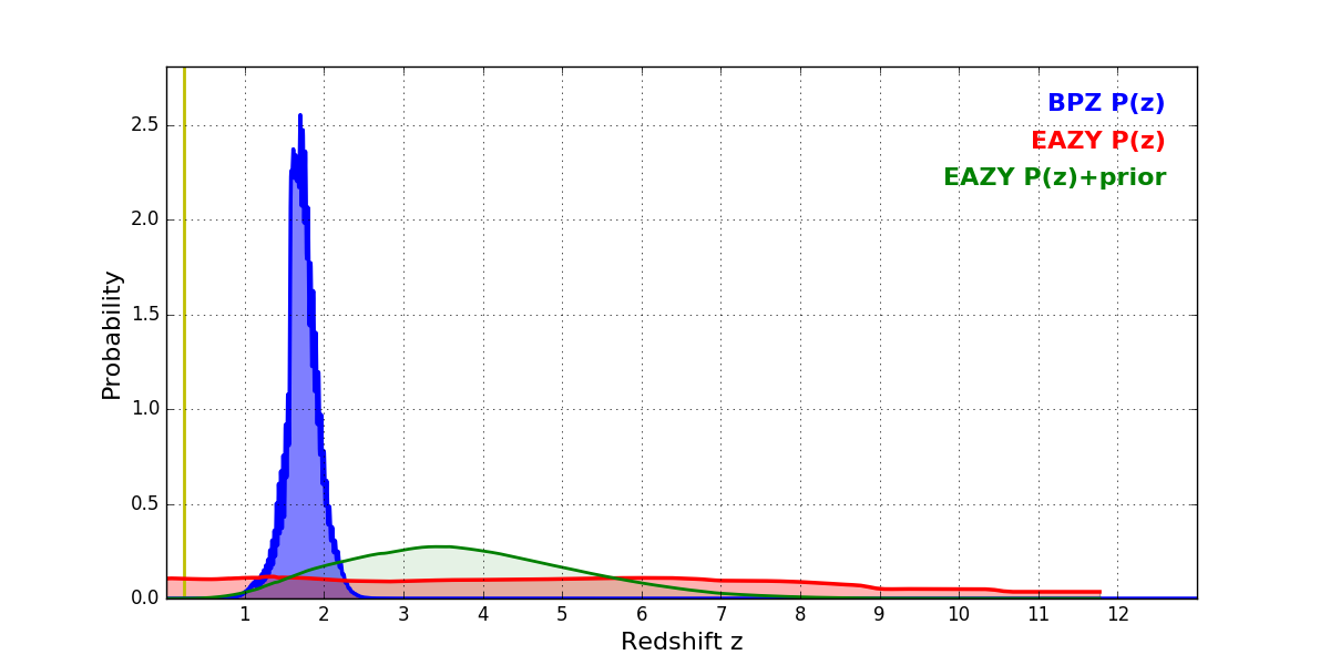 In P(z) plots: Yellow lines mark the cluster redshift z = 0.228,