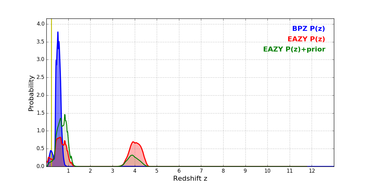 In P(z) plots: Yellow lines mark the cluster redshift z = 0.228,