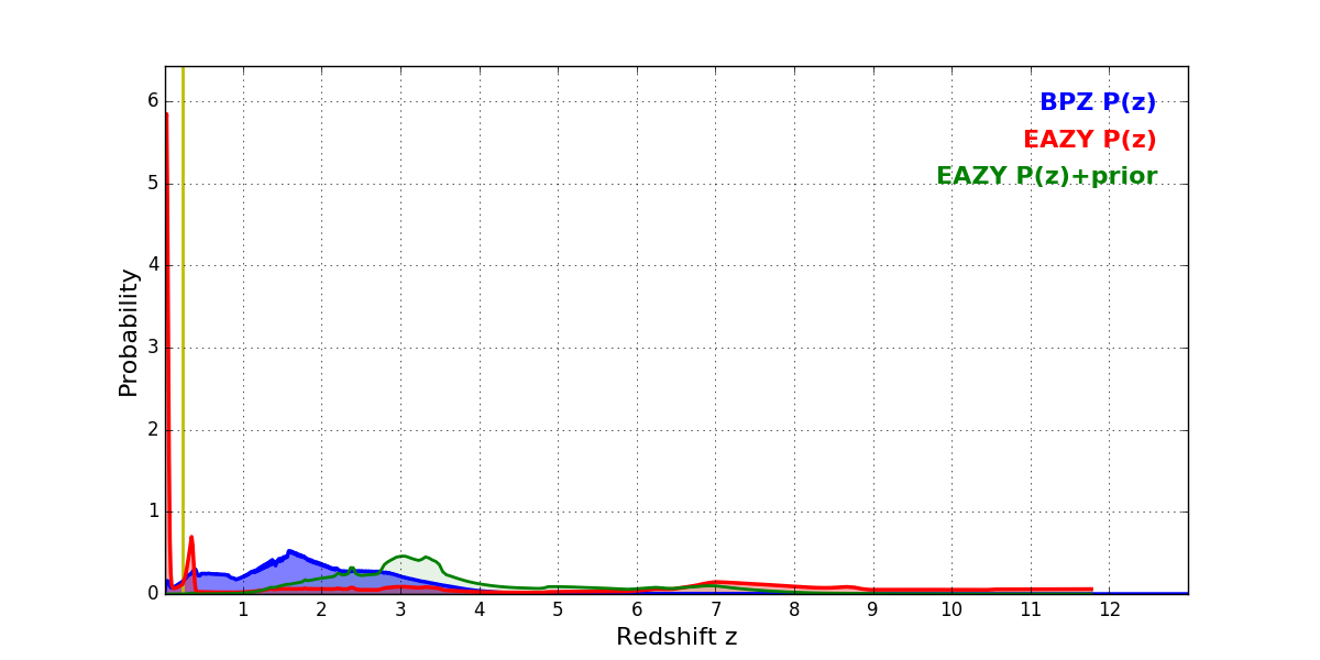 In P(z) plots: Yellow lines mark the cluster redshift z = 0.228,
