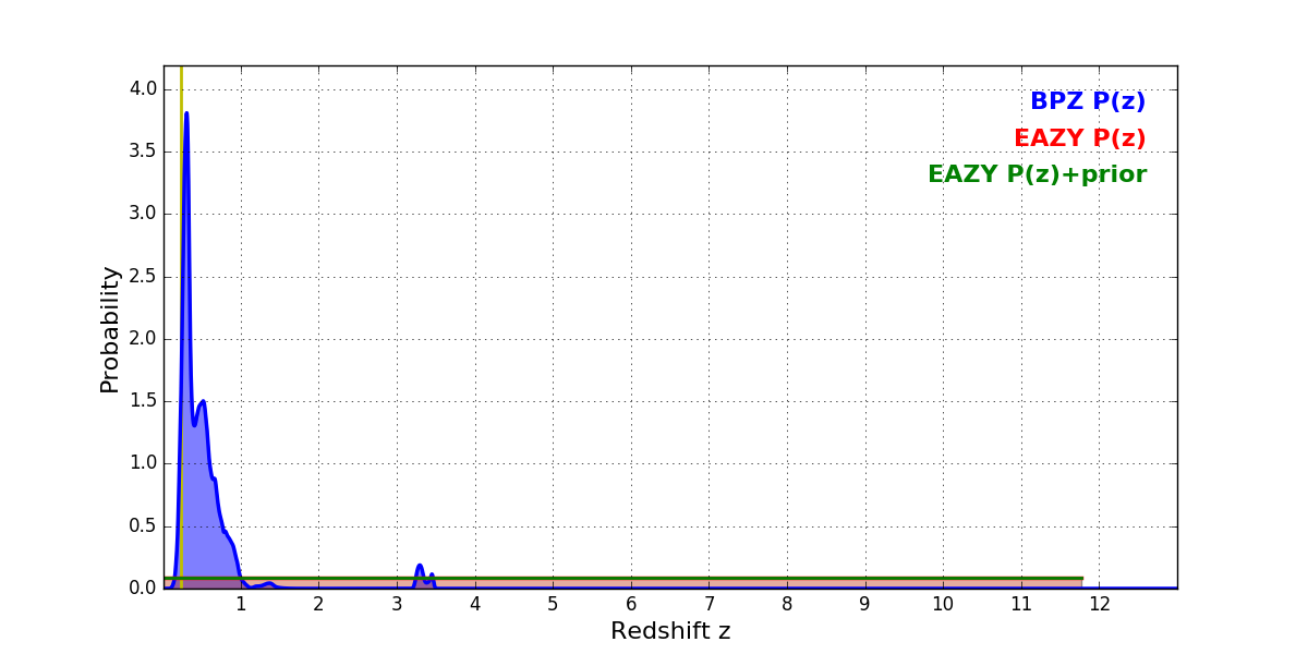 In P(z) plots: Yellow lines mark the cluster redshift z = 0.228,