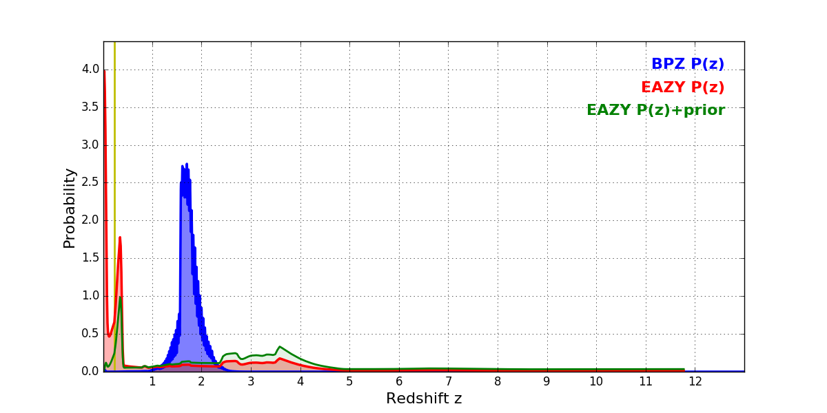 In P(z) plots: Yellow lines mark the cluster redshift z = 0.228,