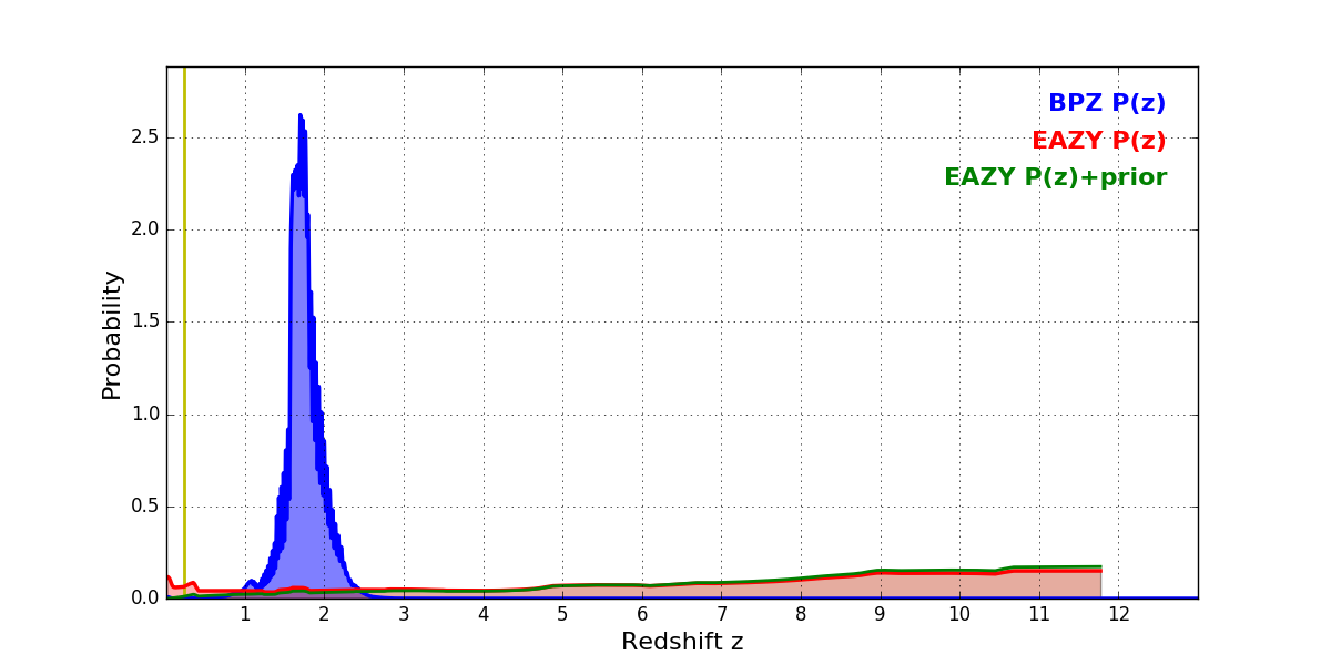 In P(z) plots: Yellow lines mark the cluster redshift z = 0.228,