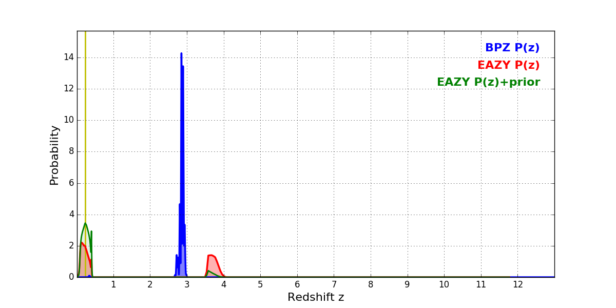 In P(z) plots: Yellow lines mark the cluster redshift z = 0.228,