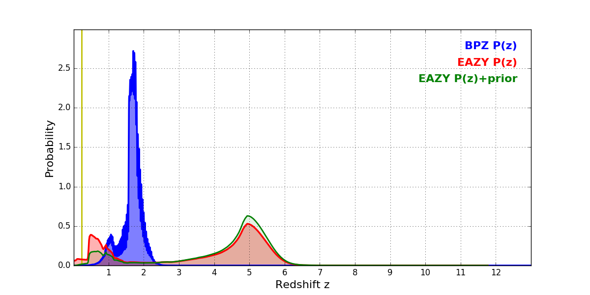 In P(z) plots: Yellow lines mark the cluster redshift z = 0.228,
