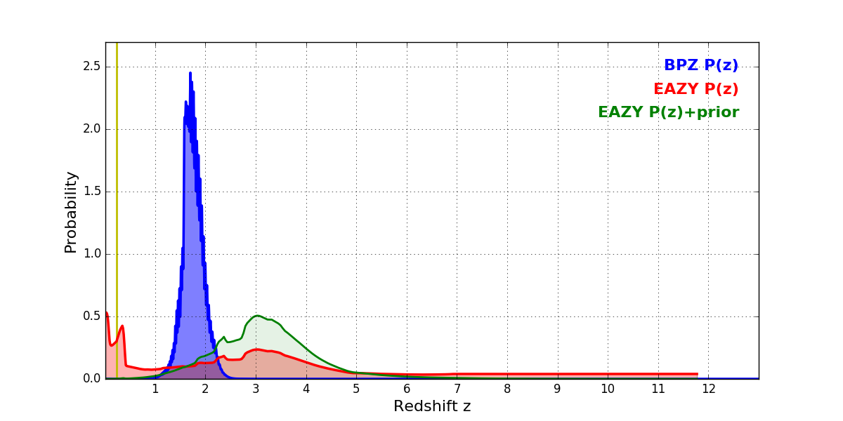 In P(z) plots: Yellow lines mark the cluster redshift z = 0.228,