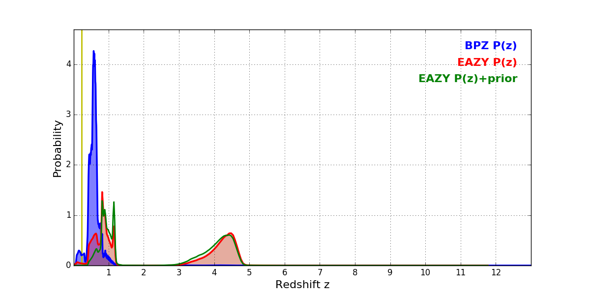 In P(z) plots: Yellow lines mark the cluster redshift z = 0.228,