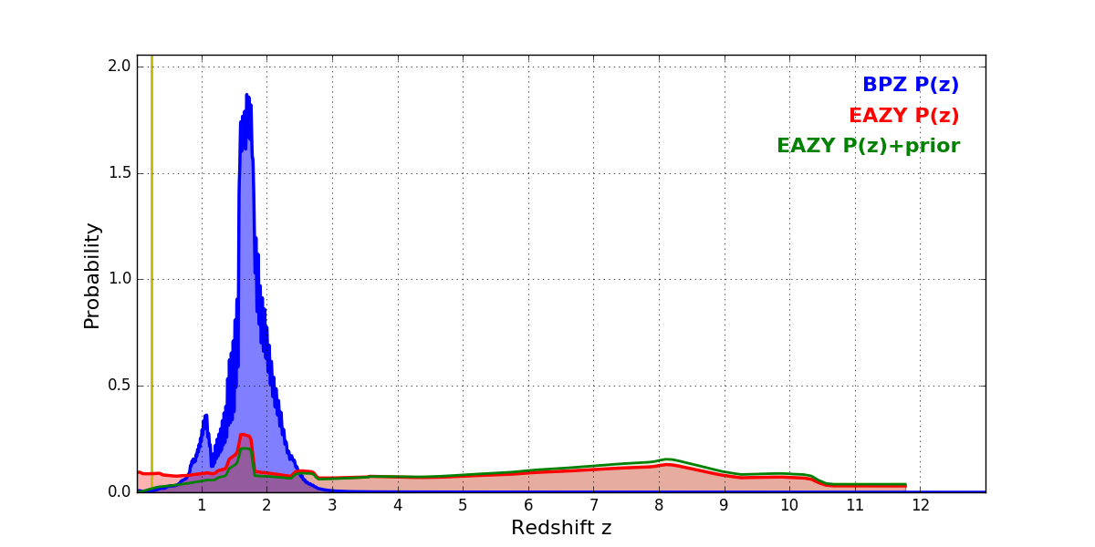 In P(z) plots: Yellow lines mark the cluster redshift z = 0.228,