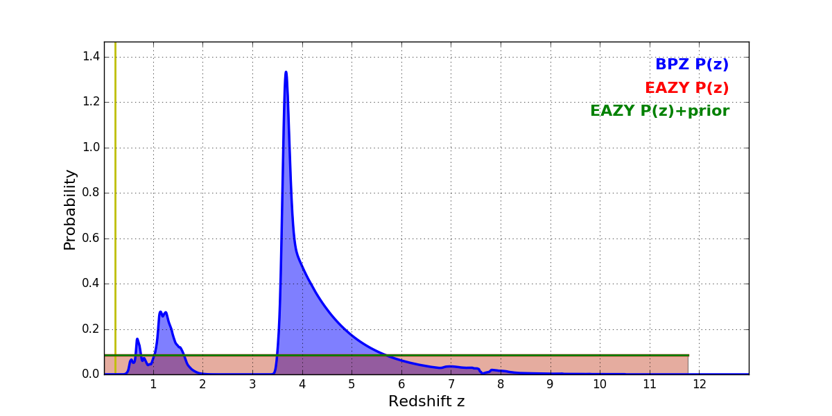 In P(z) plots: Yellow lines mark the cluster redshift z = 0.228,