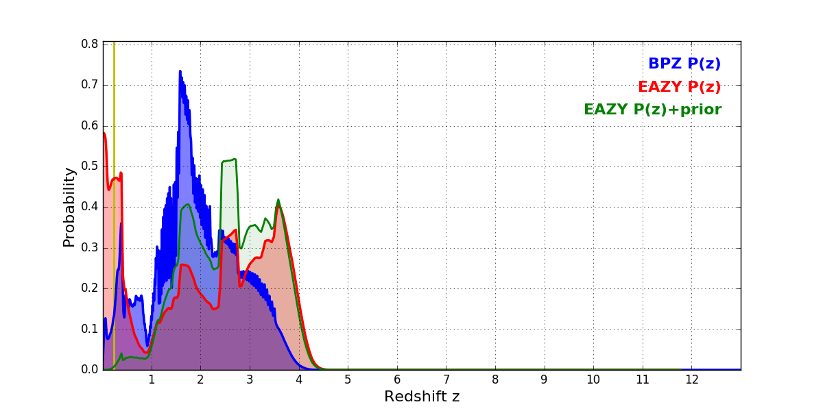 In P(z) plots: Yellow lines mark the cluster redshift z = 0.228,