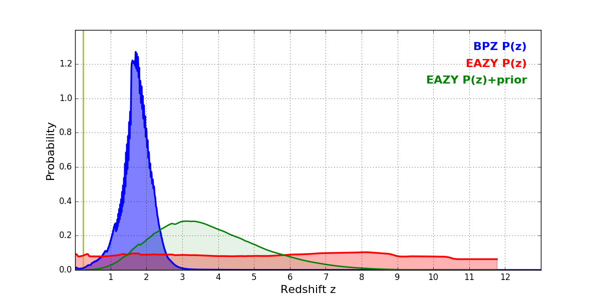 In P(z) plots: Yellow lines mark the cluster redshift z = 0.228,