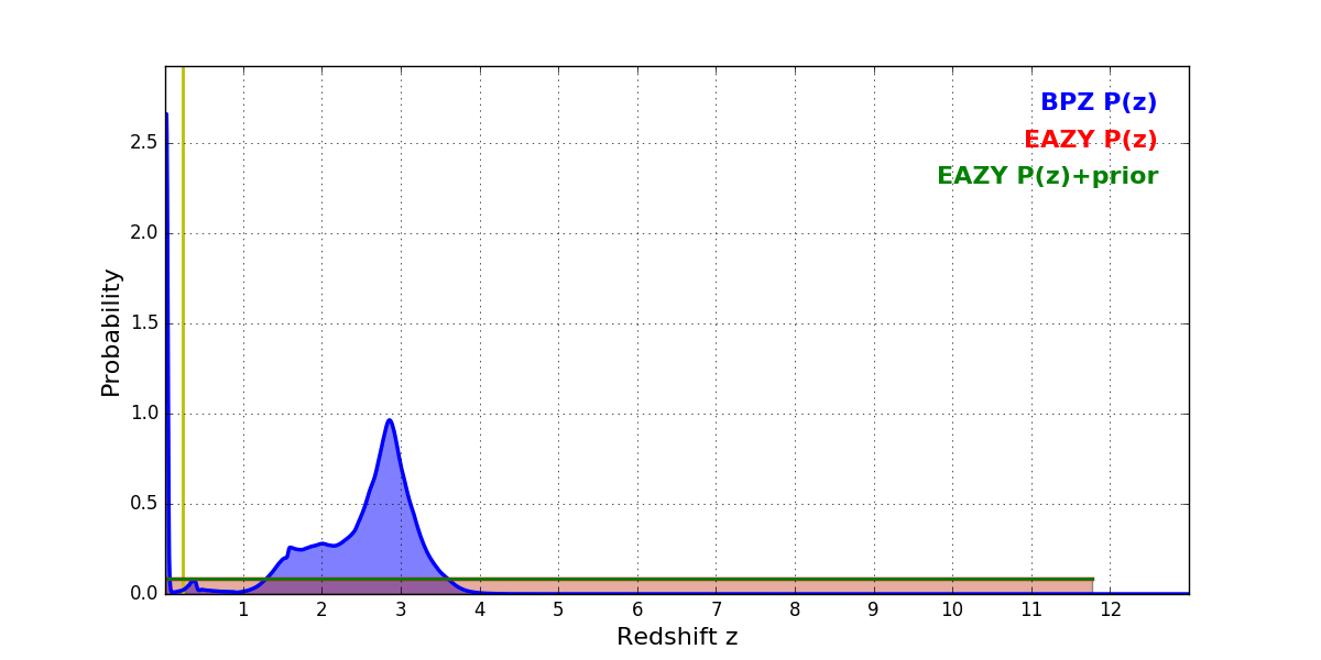 In P(z) plots: Yellow lines mark the cluster redshift z = 0.228,