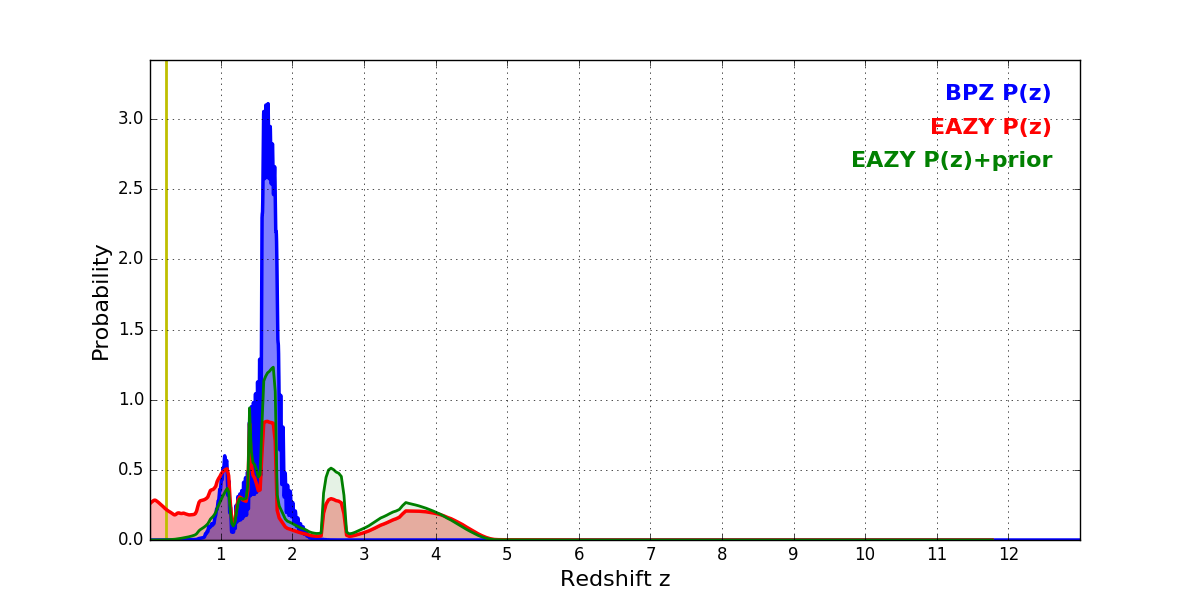 In P(z) plots: Yellow lines mark the cluster redshift z = 0.228,