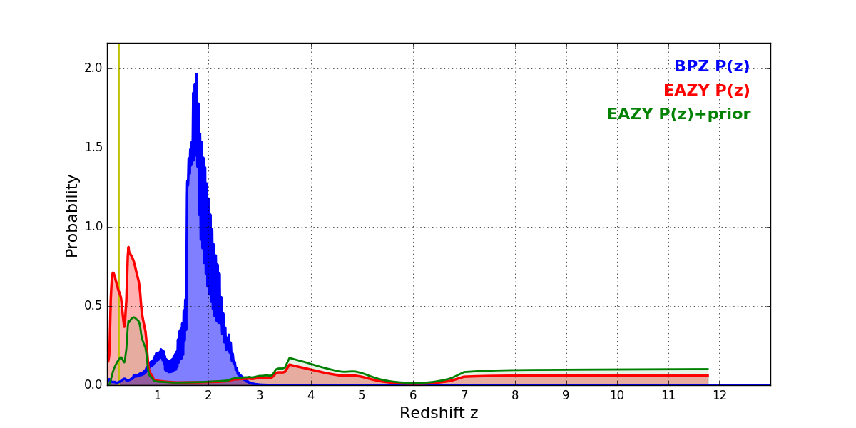 In P(z) plots: Yellow lines mark the cluster redshift z = 0.228,