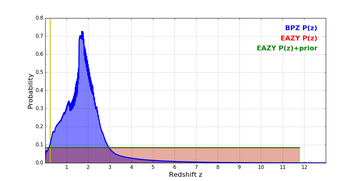 In P(z) plots: Yellow lines mark the cluster redshift z = 0.228,