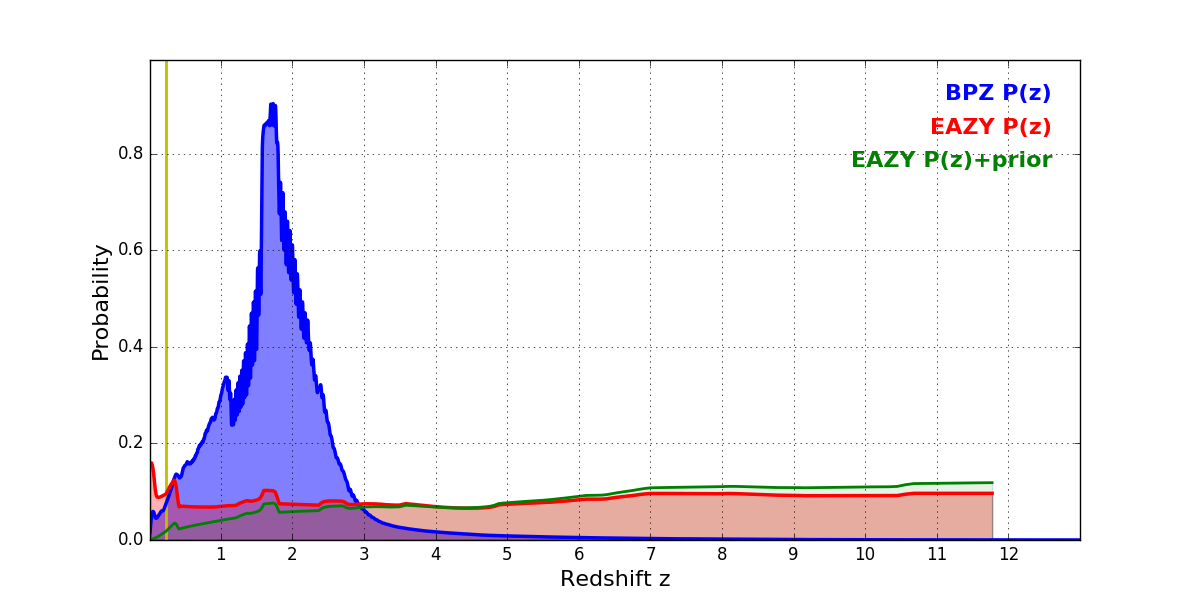 In P(z) plots: Yellow lines mark the cluster redshift z = 0.228,