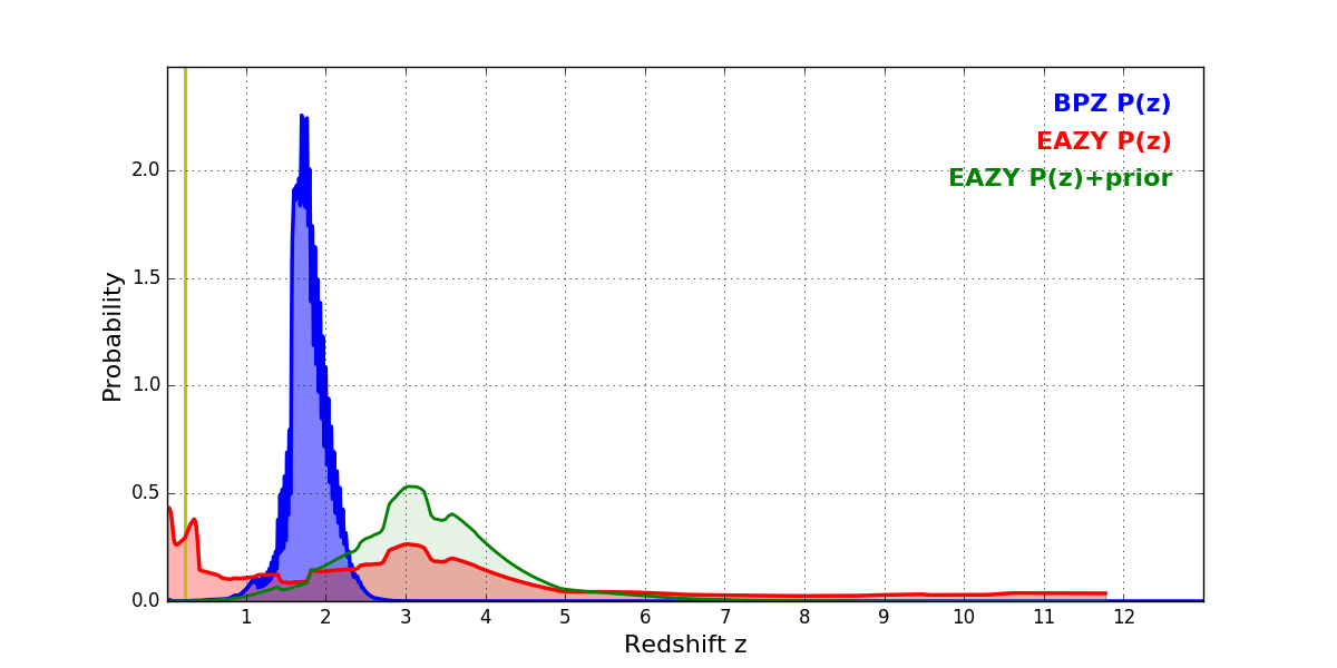In P(z) plots: Yellow lines mark the cluster redshift z = 0.228,