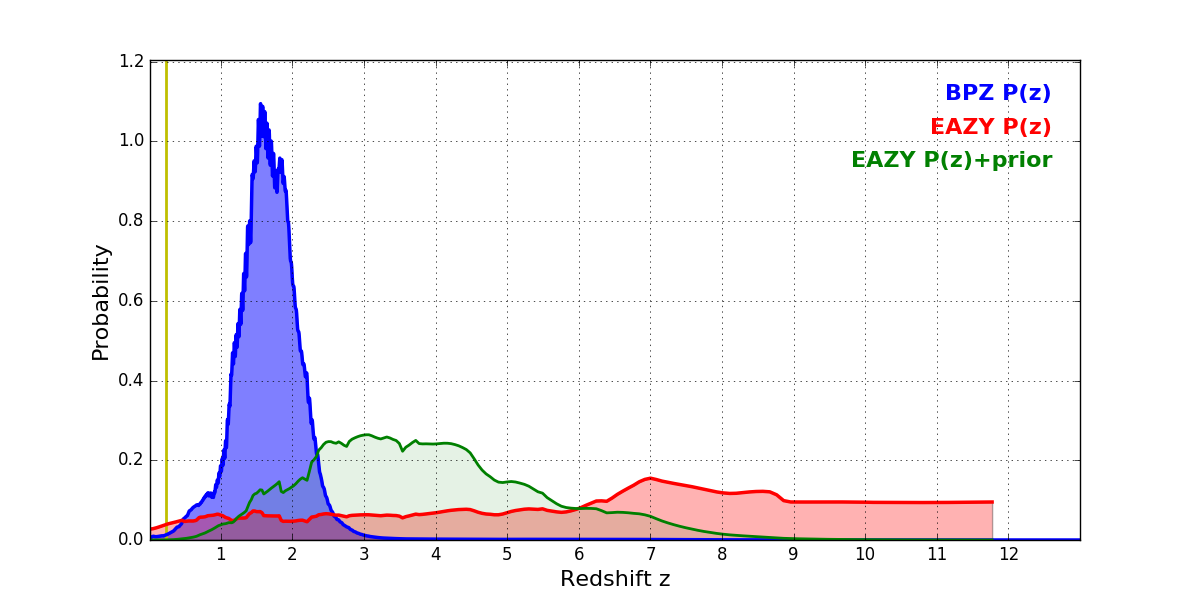 In P(z) plots: Yellow lines mark the cluster redshift z = 0.228,