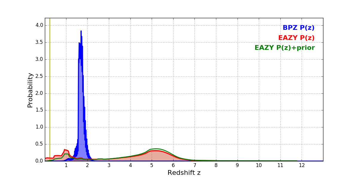 In P(z) plots: Yellow lines mark the cluster redshift z = 0.228,