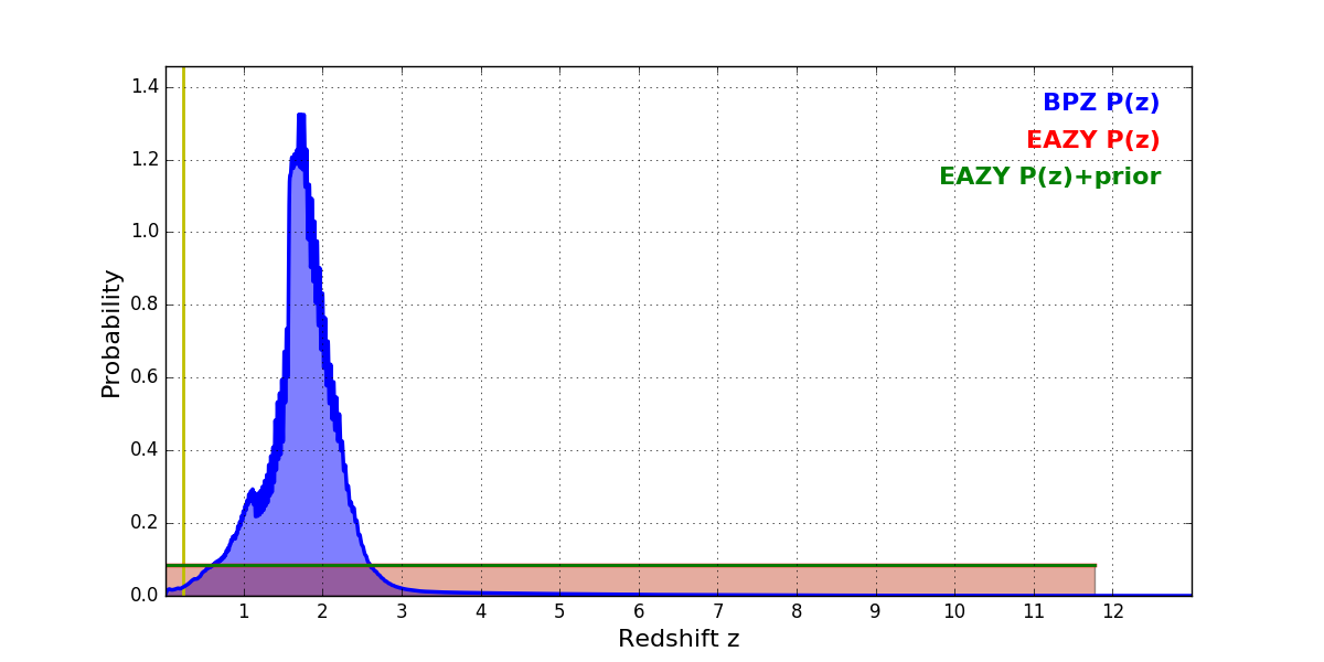 In P(z) plots: Yellow lines mark the cluster redshift z = 0.228,