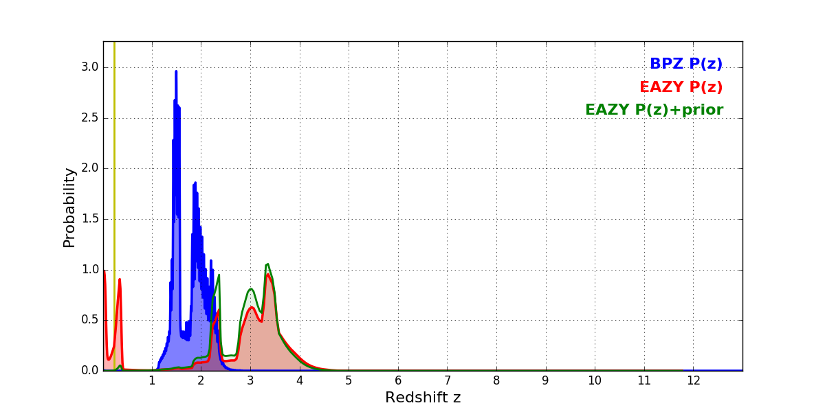 In P(z) plots: Yellow lines mark the cluster redshift z = 0.228,