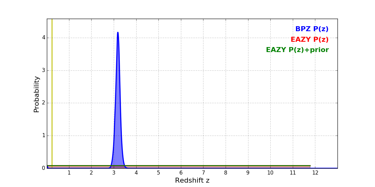 In P(z) plots: Yellow lines mark the cluster redshift z = 0.228,