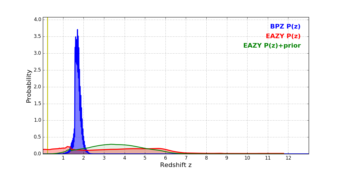 In P(z) plots: Yellow lines mark the cluster redshift z = 0.228,