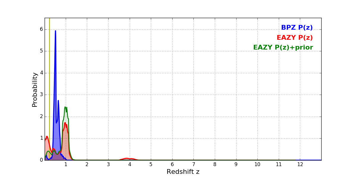 In P(z) plots: Yellow lines mark the cluster redshift z = 0.228,