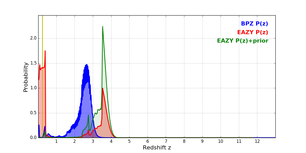 In P(z) plots: Yellow lines mark the cluster redshift z = 0.228,
