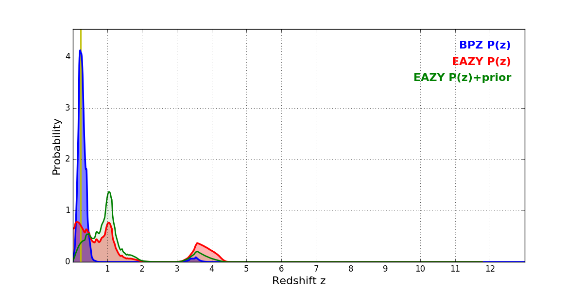 In P(z) plots: Yellow lines mark the cluster redshift z = 0.228,