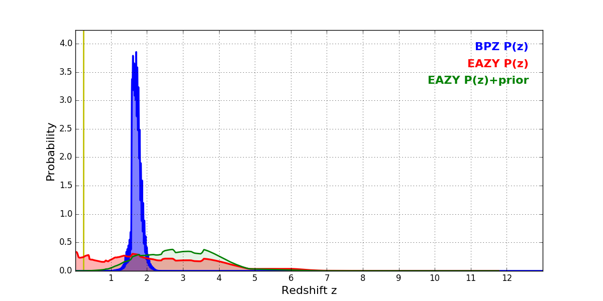 In P(z) plots: Yellow lines mark the cluster redshift z = 0.228,