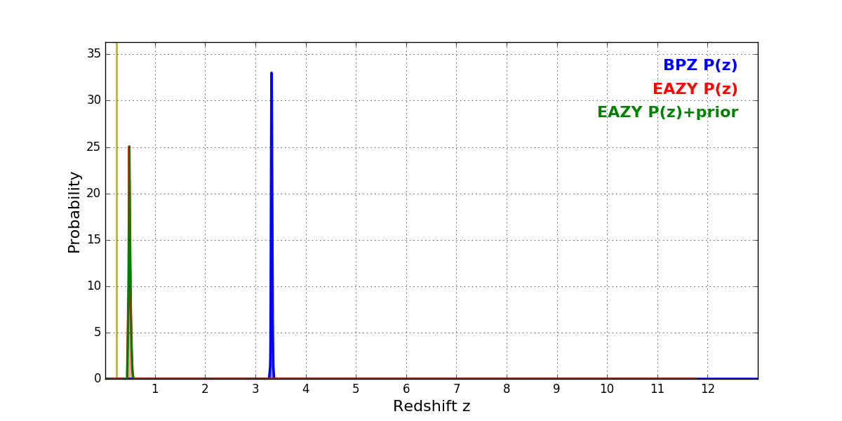 In P(z) plots: Yellow lines mark the cluster redshift z = 0.228,