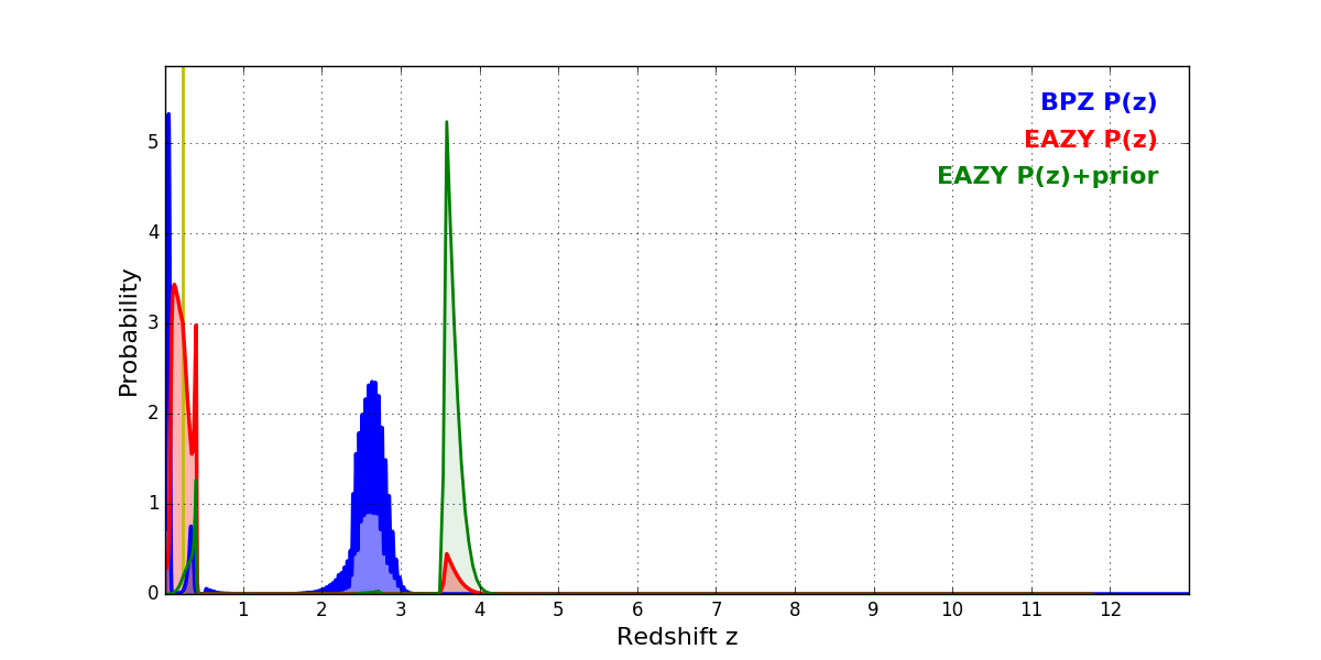In P(z) plots: Yellow lines mark the cluster redshift z = 0.228,
