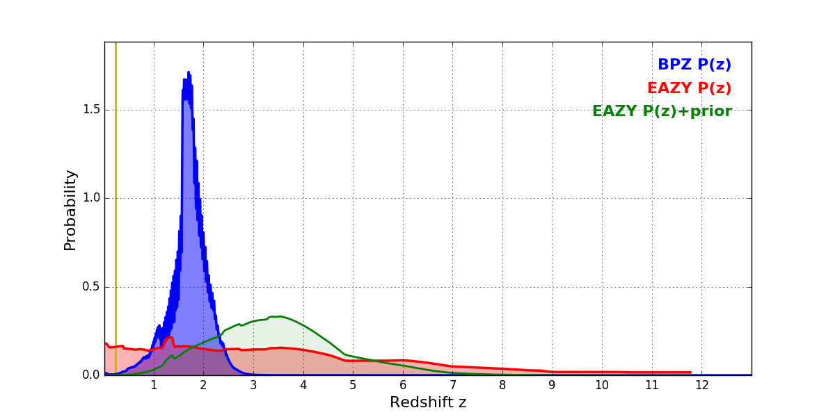 In P(z) plots: Yellow lines mark the cluster redshift z = 0.228,