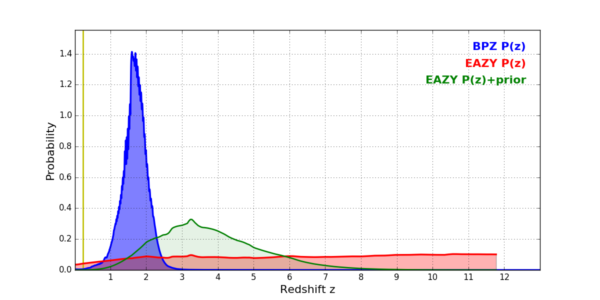 In P(z) plots: Yellow lines mark the cluster redshift z = 0.228,