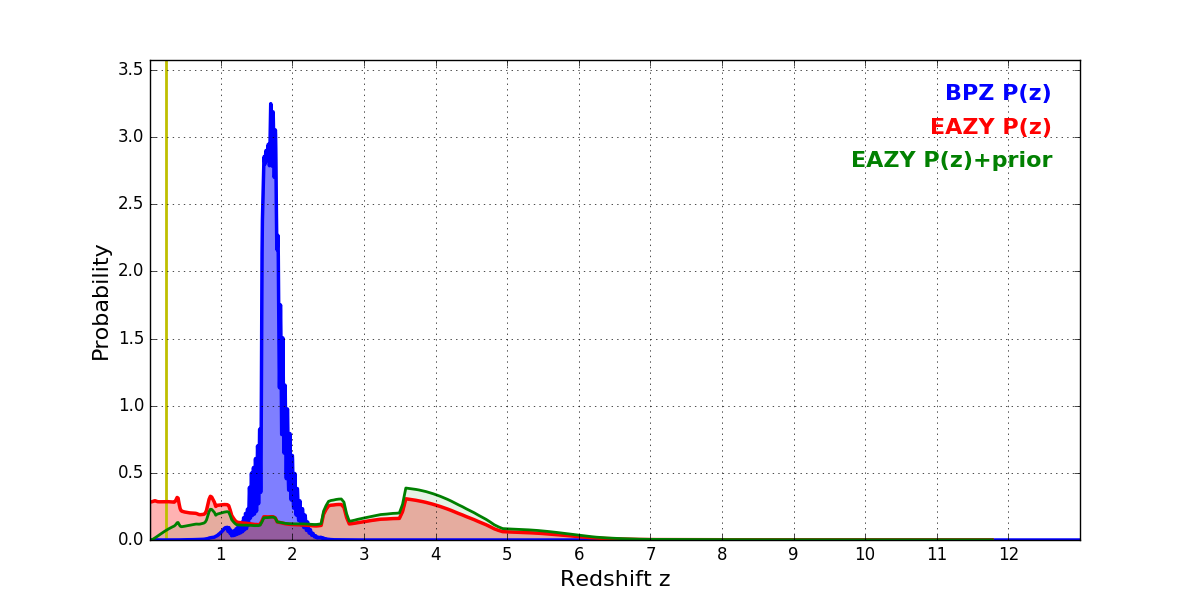 In P(z) plots: Yellow lines mark the cluster redshift z = 0.228,