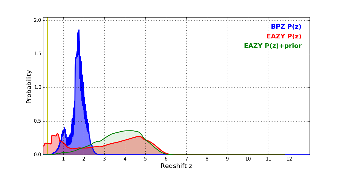 In P(z) plots: Yellow lines mark the cluster redshift z = 0.228,