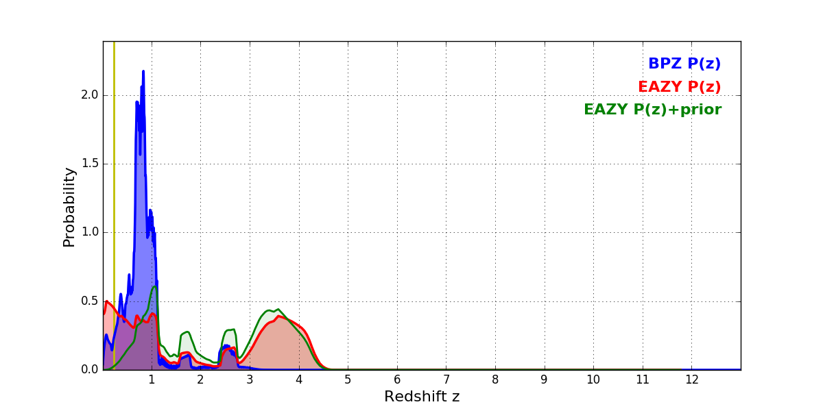 In P(z) plots: Yellow lines mark the cluster redshift z = 0.228,