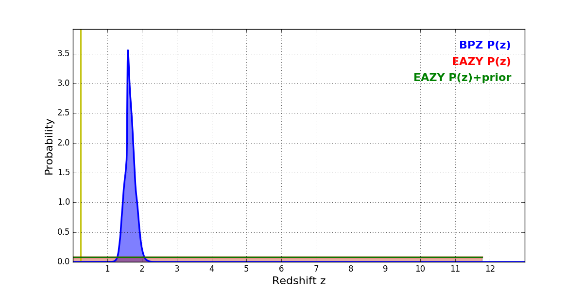 In P(z) plots: Yellow lines mark the cluster redshift z = 0.228,
