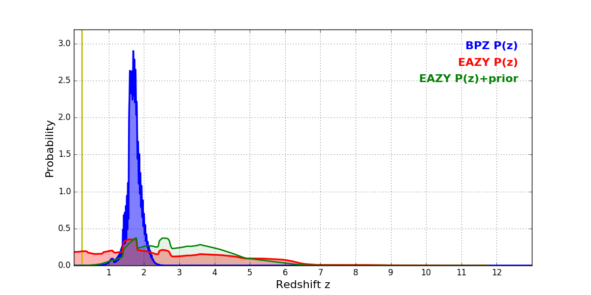 In P(z) plots: Yellow lines mark the cluster redshift z = 0.228,
