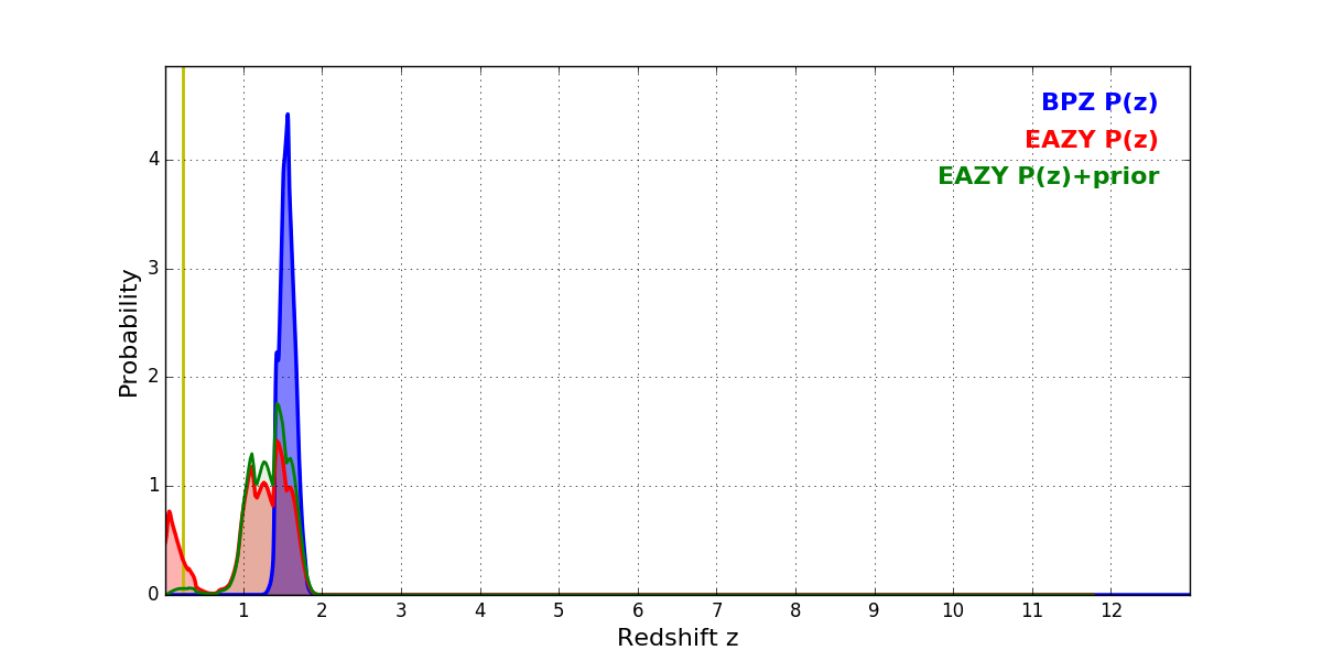 In P(z) plots: Yellow lines mark the cluster redshift z = 0.228,