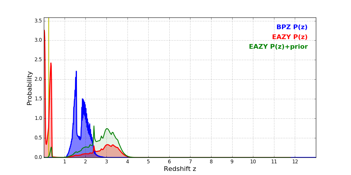 In P(z) plots: Yellow lines mark the cluster redshift z = 0.228,