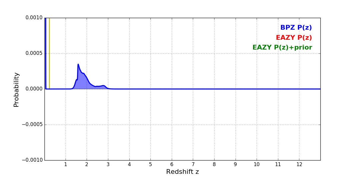 In P(z) plots: Yellow lines mark the cluster redshift z = 0.228,