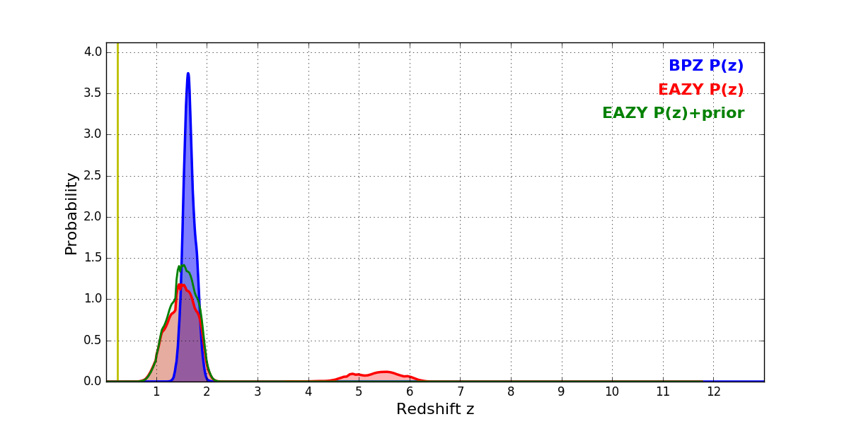 In P(z) plots: Yellow lines mark the cluster redshift z = 0.228,