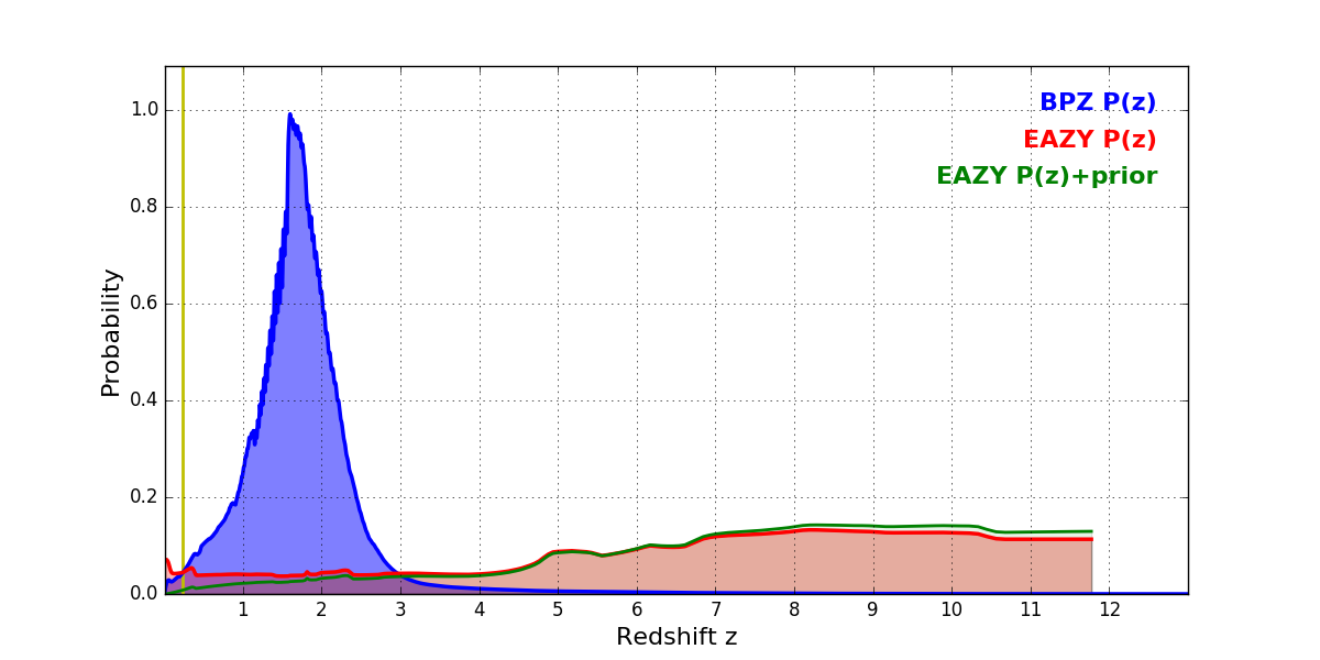 In P(z) plots: Yellow lines mark the cluster redshift z = 0.228,