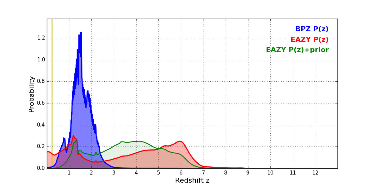 In P(z) plots: Yellow lines mark the cluster redshift z = 0.228,