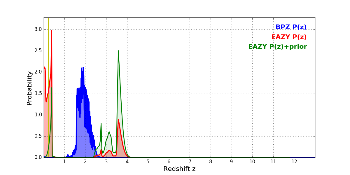 In P(z) plots: Yellow lines mark the cluster redshift z = 0.228,