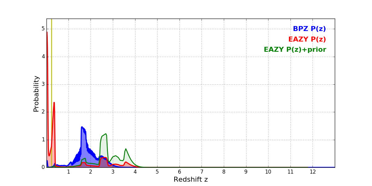 In P(z) plots: Yellow lines mark the cluster redshift z = 0.228,