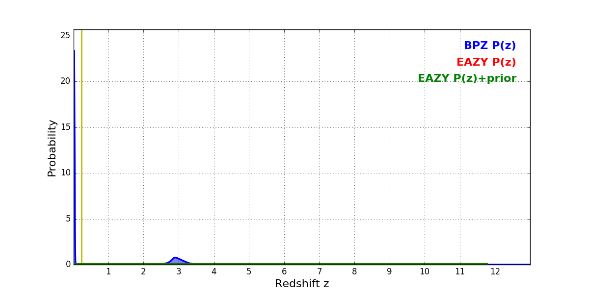 In P(z) plots: Yellow lines mark the cluster redshift z = 0.228,